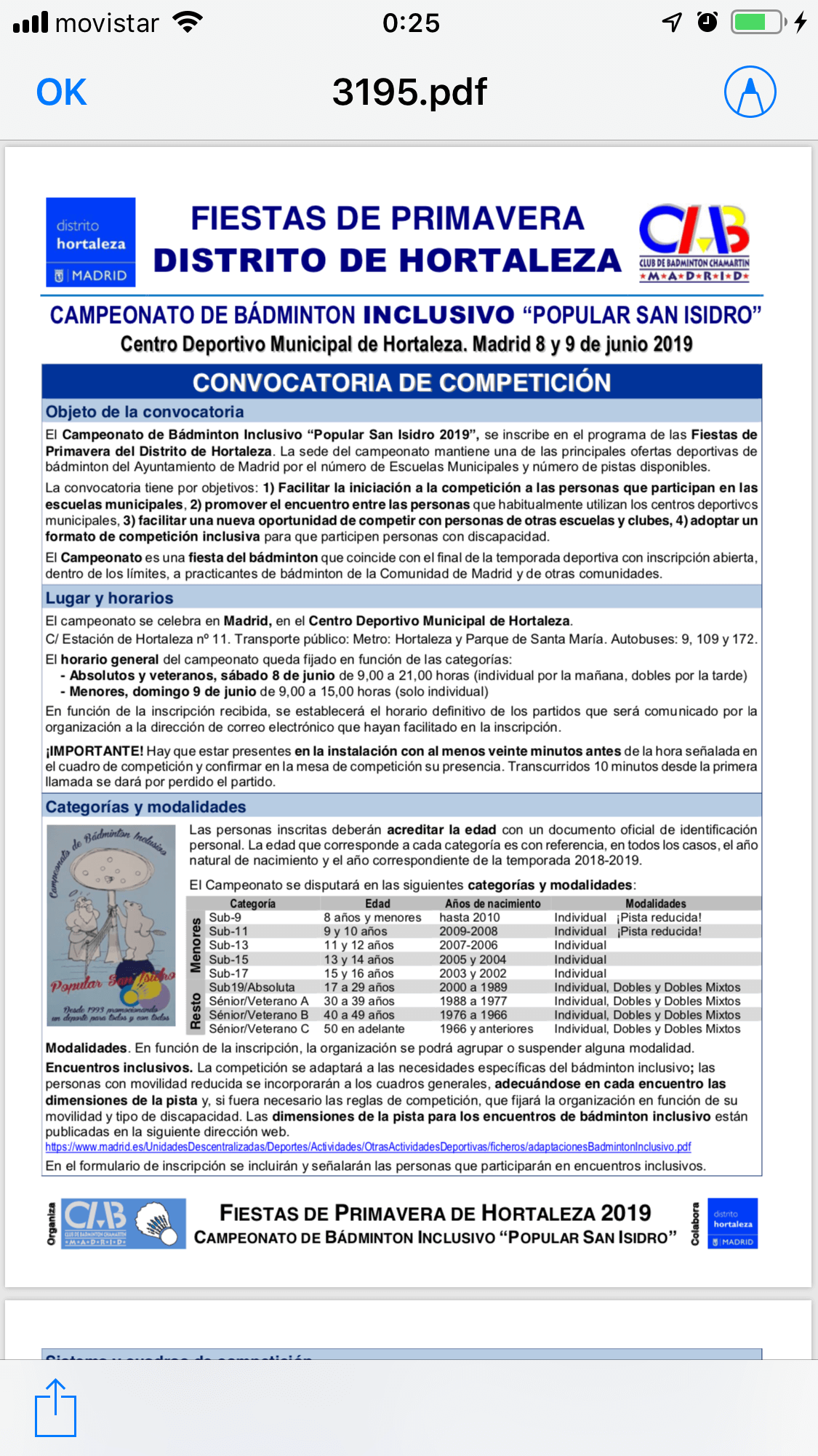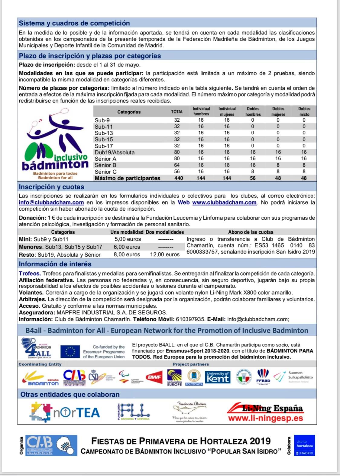Se ha celebrado el Campeonato de Bádminton Inclusivo «Popular San Isidro 2019», los días 8 y 9 de junio en el Centro Deportivo Municipal de Hortaleza (Madrid)