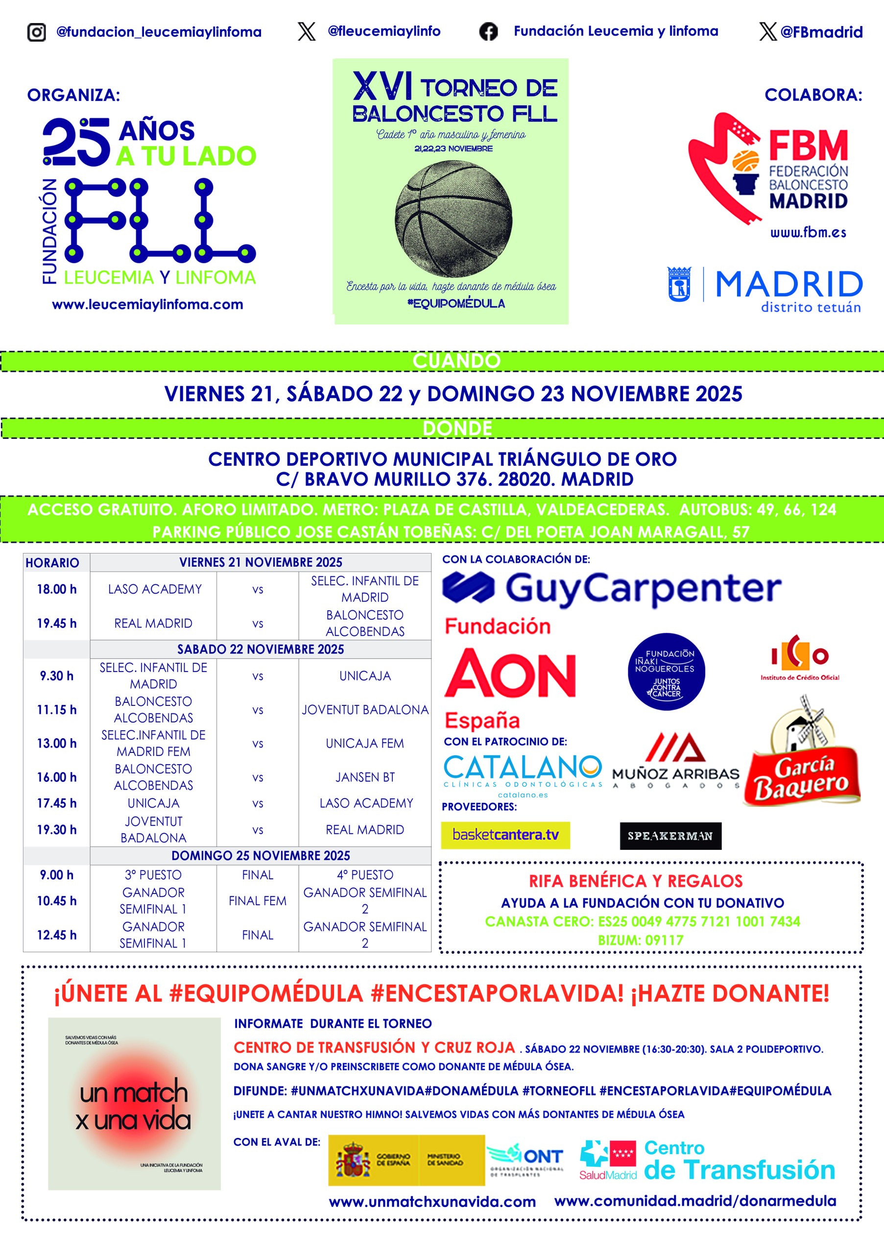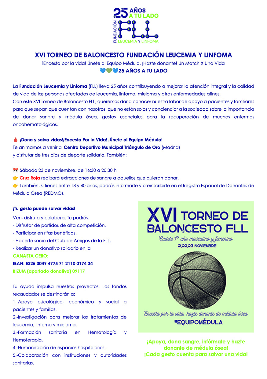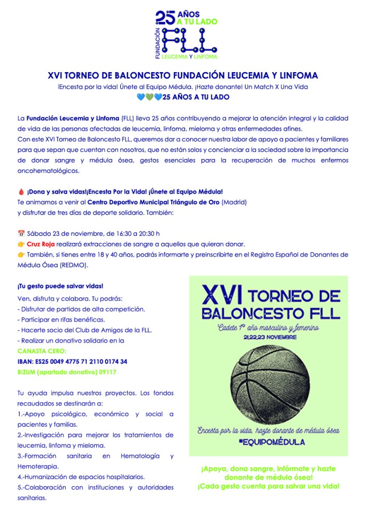 La Fundación Leucemia y Linfoma, la FBM y el Centro de Transfusión de la CM ya lo tienen todo listo para la celebración del XVI Torneo de Baloncesto FLL, que se disputará este fin de semana, 21, 22 y 23 de noviembre, en el Centro Deportivo Municipal “Triángulo de Oro” (Bravo Murillo, 376, Madrid), con el apoyo inestimable de la Junta de distrito de Tetuán del Ayuntamiento de Madrid. Un año más, el mejor baloncesto de cantera se une a la solidaridad para apoyar a las personas afectadas de leucemia, linfoma y mieloma y salvar vidas.
